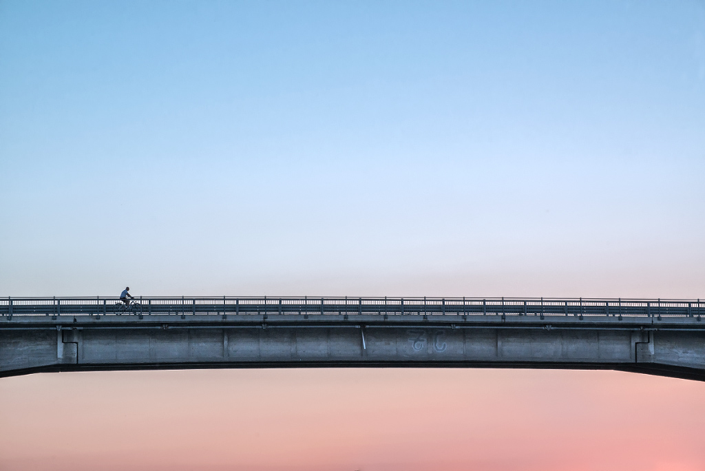 Per me semplicemente deliziosa: un passaggio del ciclista, in un mondo di delicato cromatismo, entro un cielo diviso dal ponte in due delicati emisferi di rosa ed azzurro. Ottima per me anche la armonia di geometrie pulitissime che si crea con la composizione.