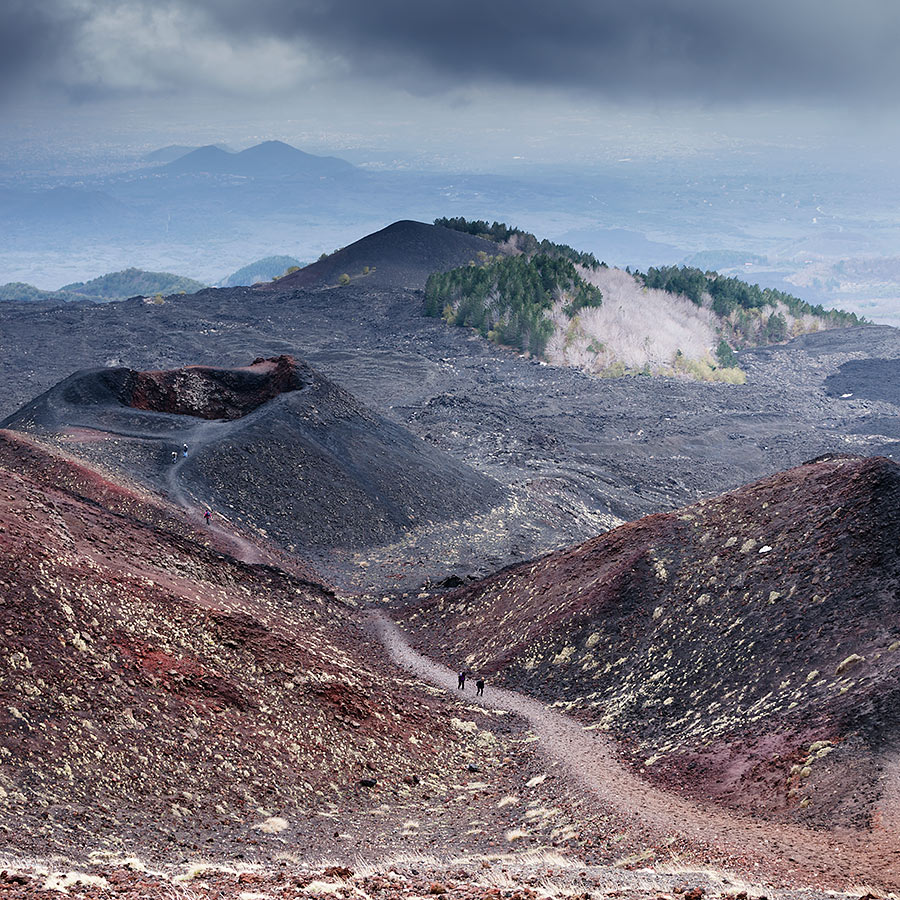 lo scatto riprende i Crateri Silvestri sull'Etna, nei pressi del Rifugio Sapienza (1900 d'altezza circa). Quelli di colorazione verde sono quasi sicuramente pini larici, ma francamente non so se lo sono anche quelli più chiari. A quelle altezze si trovano anche faggi e betulle, ma non credo si tratti di queste ultime.