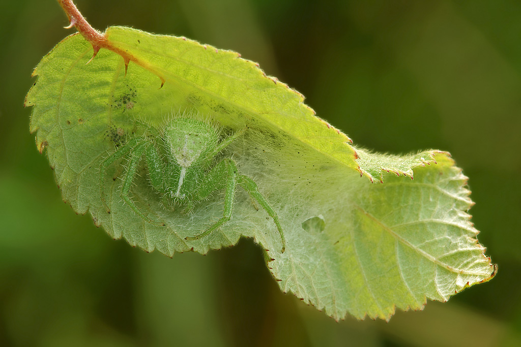La femmina di Heriaeus, mimetizzata con il verde della foglia, attende la schiusa delle uova...i piccoli presentano una colorazione con tratti rossi...che perderanno da adulti...appena l'istinto chiamerà produrranno un filo di seta che allungheranno nell'aria...attendendo che il vento li trasporti via