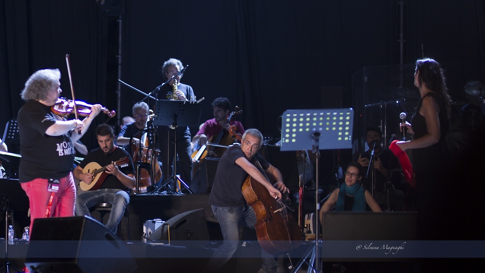 La foto e'stata scattata durante le prove della Notte della Taranta, il megaconcerto salentino che celebra la musica popolare del luogo. Nello scatto proposto il contrabbassista (Giovanni Sollima) era davvero "tarantato" ovvero posseduto dal ritmo indiavolato della musica.