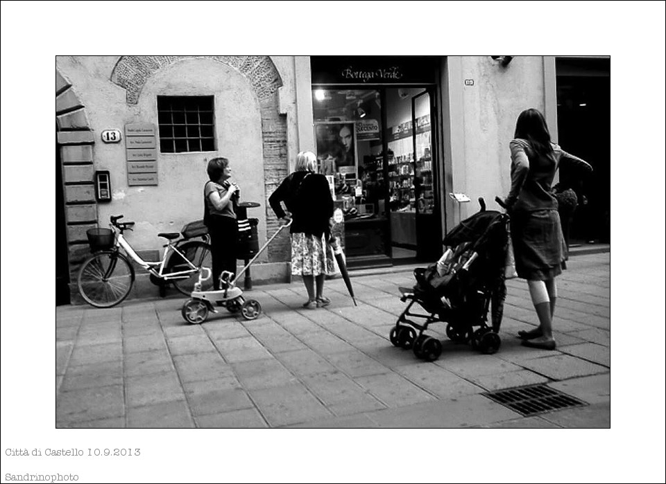 A partire da destra una giovane mamma con il suo passeggino, al centro sempre una mamma con il triciclo e poi ancora lei avanti negli anni con una bici,