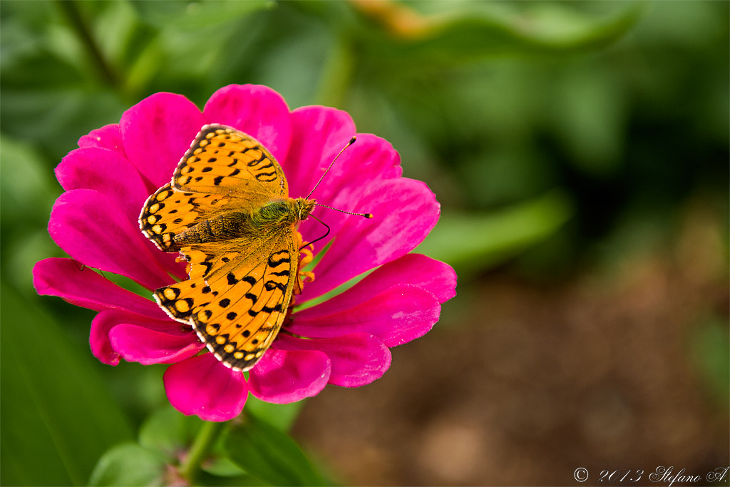 L'uso di un "teletto" ti ha permesso di stare sufficientemente lontano quindi di non disturbare la farfalla facendola volar via... l'uso di un diaframma come il 5.6 che hai usato invece ti ha dato una sufficiente profondità di campo per avere nella zona di fuoco sia la farfalla che il fiore e di sfocare lo sfondo che, purtroppo, era troppo vicino (sarebbe stato meglio ancor più sfocato).