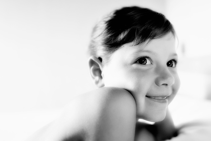 la scelta di una forte illuminazione asseconda il momento molto solare della piccola; peccato che quel forte bagliore alle spalle di lei riverberi anche sulla guancia e si mangi parte dei volumi del viso.