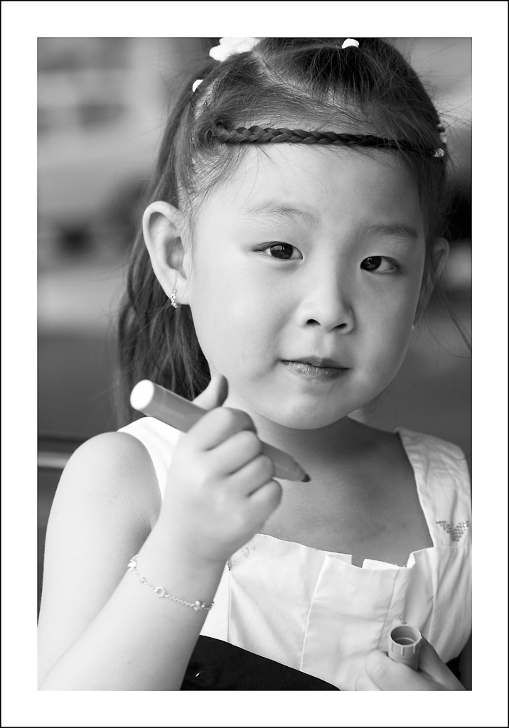 Mi piace, lei è molto espressiva e giocosa, ma ha negli occhi un'attenzione che tradisce una curiosità che è prerogativa dei bambini.