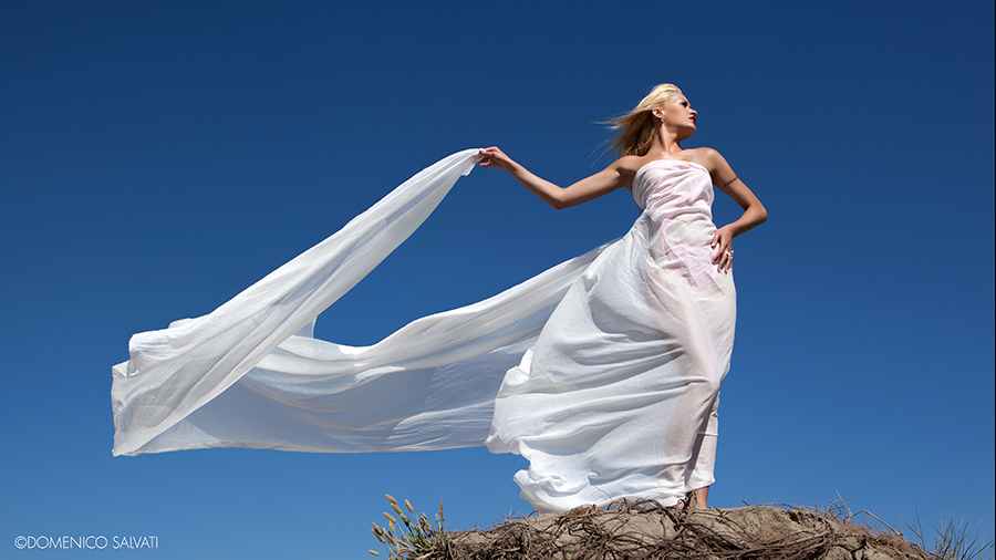 Un'idea così alberga nella mente per settimane perché si pensa a come realizzarla, poi si trova la stoffa, molto leggera perché deve volare e coprente perché non deve essere trasparente, non troppo, poi si trova il posto ed il cielo giusto che deve essere blu perché la stoffa è bianca e nuvole non andrebbero bene, e poi lei