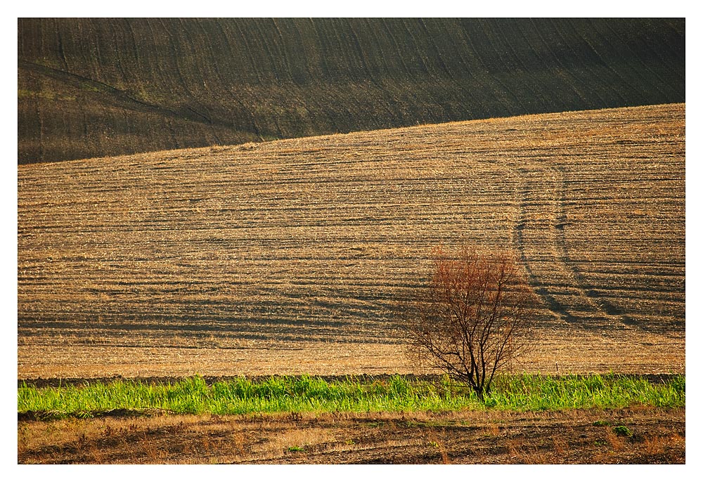davvero un bel grafismo colto dalla nuda terra, per costruire una immagine elegante. Se solo l'alberello fosse stato più a sinistra, tanto da controbilanciare al millimetro in impostanza compositiva il binario curvilineo sul campo..