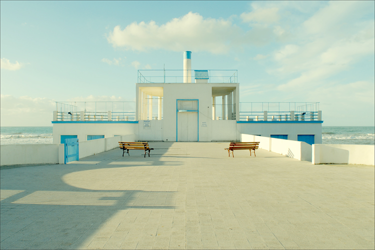 L'ombra a sinistra sul piazzale è bilanciata dalla luce sotto il colonnato sempre a sinistra; viceversa la luce, sul piazzale a destra, si contrappone all'ombra sotto il colonnato. La struttura è di una bellezza impressionate. Dal vivo ho sempre colto con piacere le costruzioni del lungomare di Ostia ma con le tue foto ho imparato a coglierne i minimi particolari grazie all'assenza di persone che distraggono e confondono nella visione dal vivo. In questa foto, tutta giocata su colori freddi, la bravura è stata far risaltare proprio le panchine di colore caldo che rappresentano due punti in cui l'occhio si "riposa" prima di andare ad esplorare altre zone dell'immagine. Senza quei due punti, secondo me, la fotografia non sarebbe stata altrettanto godibile.