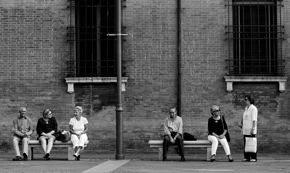 Mi piace il palo che divide la scena in due parti, dove oltre ai due gruppi di donne che parlano, colpisce la postura degli uomini.