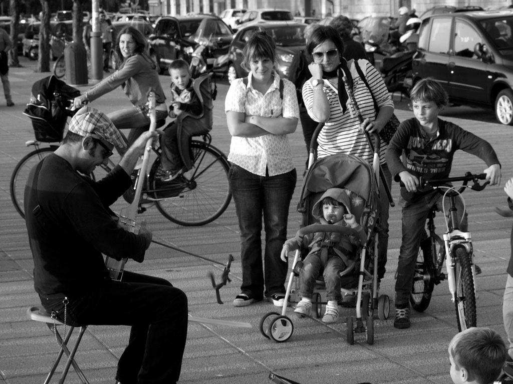 Bella composizione, ottimo bianconero e simpatica scenetta... non so che diaframma hai usato ma uno o due stop in più ti avrebbero dato la profondità di campo sufficiente per far rientrare nella zona di fuoco anche la famigliola che occupa una parte sostanziosa nel fotogramma.