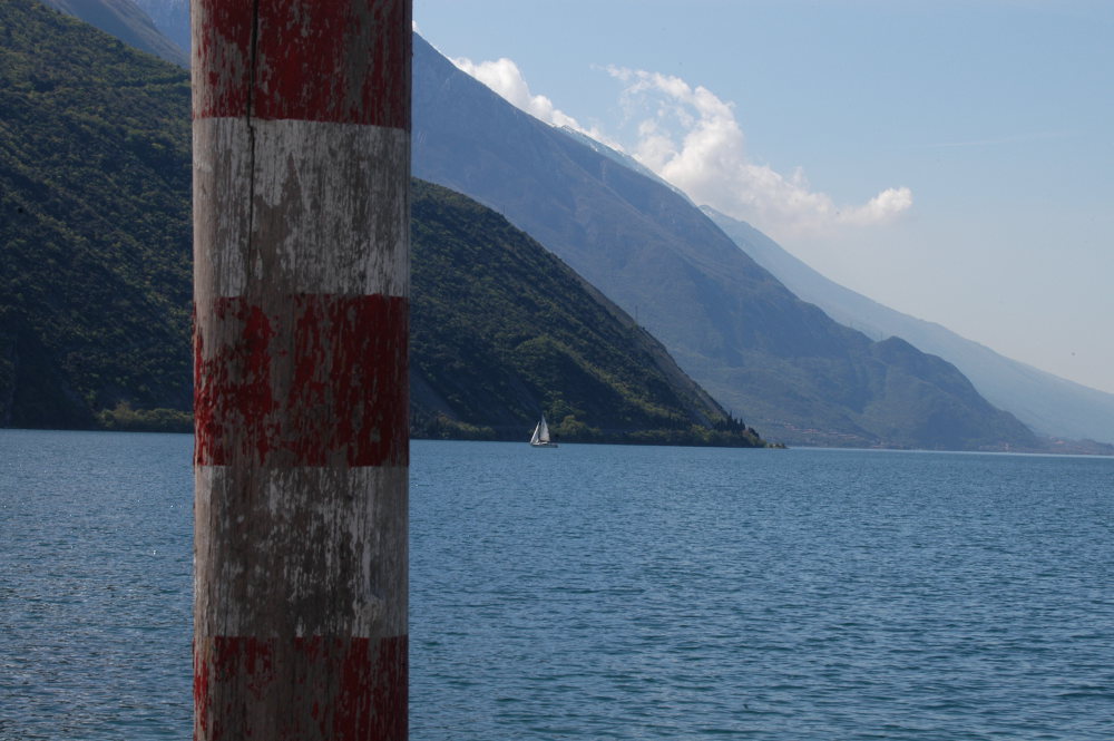 Buona l'idea di rappresentare le onde con le montagne che si tuffano nel lago (di Garda) però se posso esprimere un parere il pilone in primo piano è un pò troppo invasivo, inoltre la terza "onda" è stata tagliata prima che entri nell'acqua.