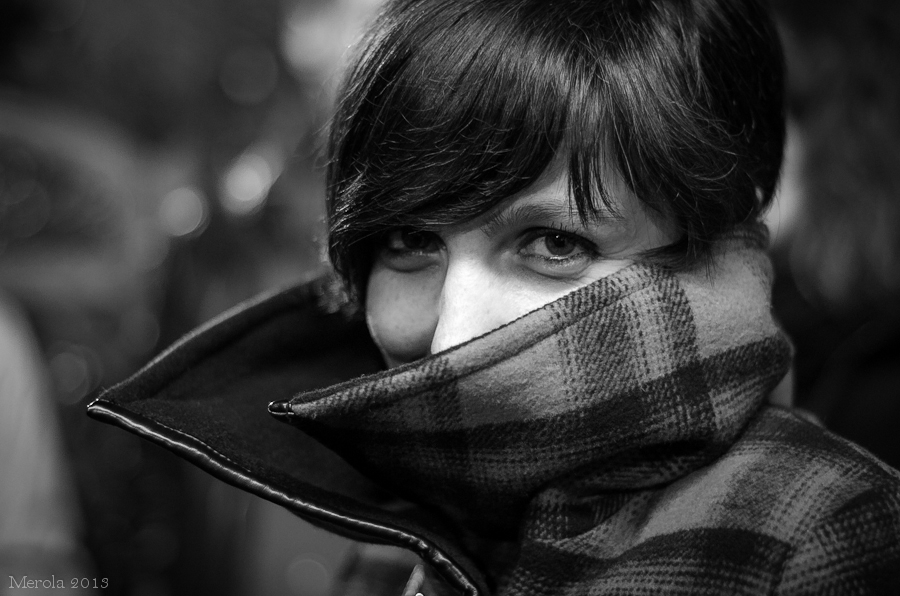 Lo sguardo e il sorriso celato dal bavero, sono la vera perla di questo ritratto. L'occhio e le geometrie del colletto andrebbero maggiormente valorizzate tagliando un poco in alto e a dx (spalla sinistra) . Cosi facendo si avrebbe l'occhio sul terzo e il disegno del bavero segnerebbe una leggera diagonale.