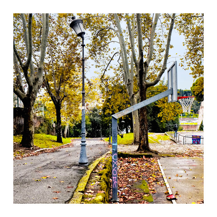 Il lampione con il collo spezzato associato al canestro offre uno spunto interessante in termini di ricerca di grafismi. La post produzione sposta peró l'accento sul piano cromatico, con una resa dei verdi un po' troppo "fluorescente" che temo finisca per confondere le idee all'osservatore.