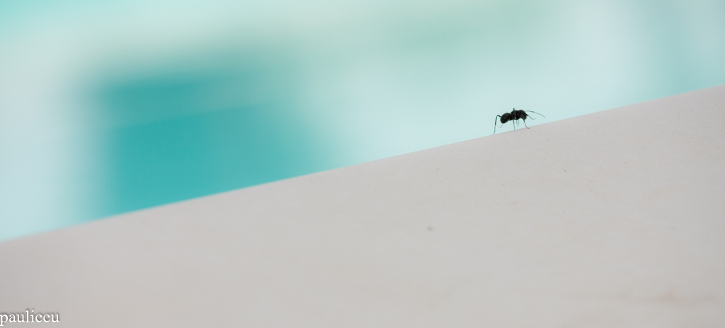La formica cammina su una lastra in marmo grezzo di un bordo piscina.