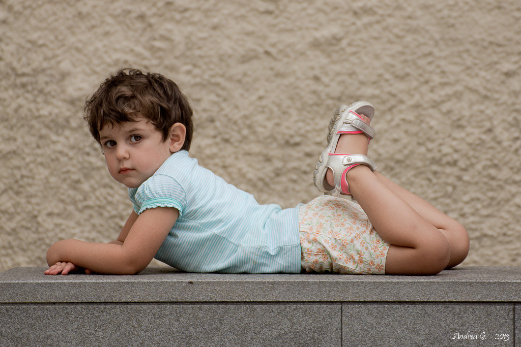 Non so perche', forse per quella maglietta azzurra, ma mi ricorda quelle foto in bianco e nero, anteguerra, ove i bambini avevano solo il vestito o gli occhi a colori, ritoccato durante la stampa.
