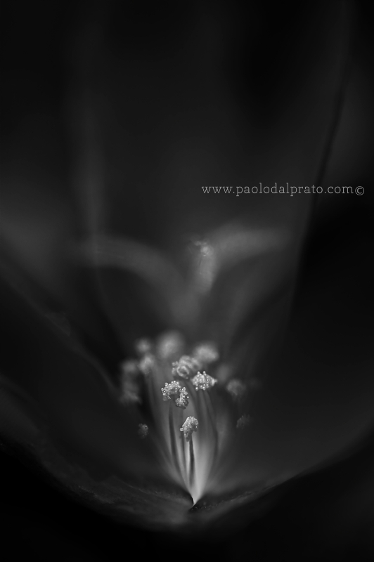 Bella esecuzione...mi piace l'effetto fiamma...ovvero: i pistilli centrali nitidi ed illuminati sembrano lingue di fuoco che fuoriescono da una fessura....mi piace tutto...dalle zone in luce a quelle in ombra, passando per la composizione ed il b/n...bravo.