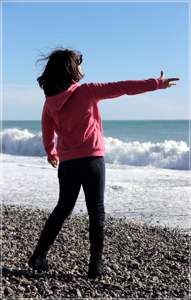 Perdonami, ma non riesco a capire il significato di questo scatto. Una bimba di spalle con sullo sfondo il mare, e un gesto che sicuramente avrà un significato, ma quale? Un gioco? Allegria? Felicità in una bella giornata?