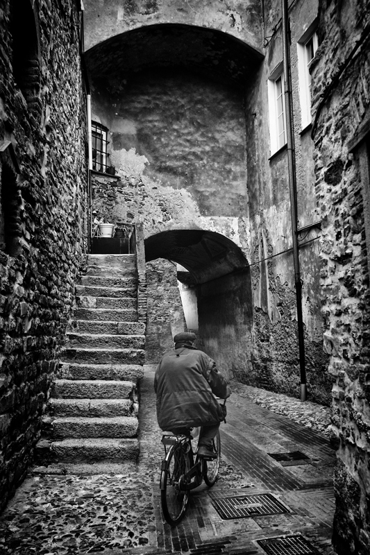 Io quì ce la vedo la street : l' uomo piccolo che arranca nel vicolo scuro e antico, quasi si confonde con esso a farne parte integrante, in una quotidianetà malinconica e grigia che è propria del borgo quasi dimenticato.