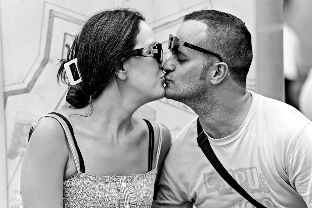 Un primo piano molto stretto che diventa piú una descrizione dei soggetti e dei dettagli del loro abbigliamento, piuttosto che un racconto di un bacio. Questo commentandola in quanto postata in street, ma anche leggendola come un doppio ritratto, la vedo penalizzata dal peso eccessivo che assumono alcuni elementi (in particolare gli occhiali da sole) rispetto alla rappresentazione delle due persone. Anche lo sfondo é un po' di disturbo. _________________ Franco