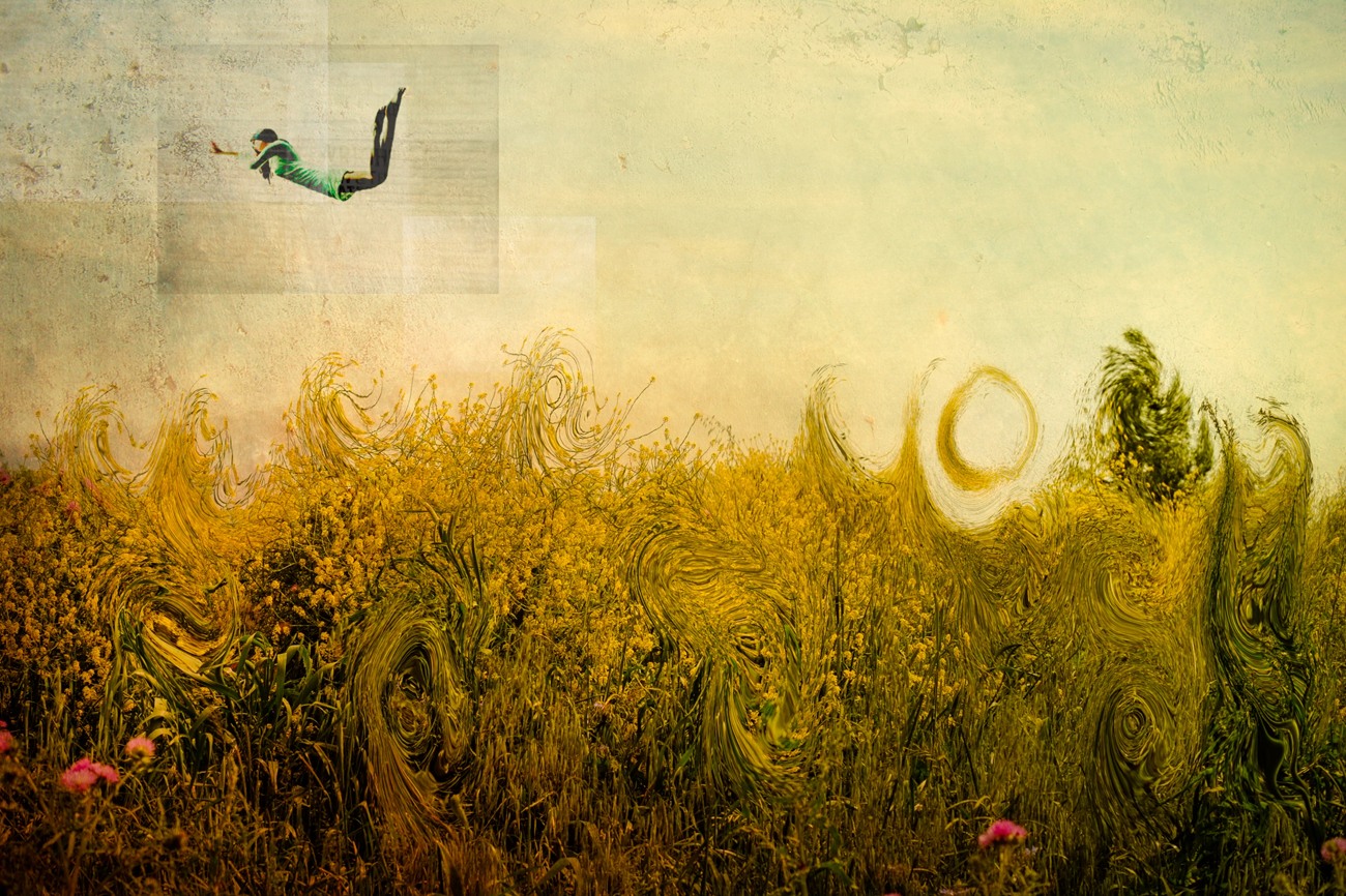 La ragazza che vola ricorda i dipinti di Chagall mentre la vegetazione in basso lo stile Van Gogh