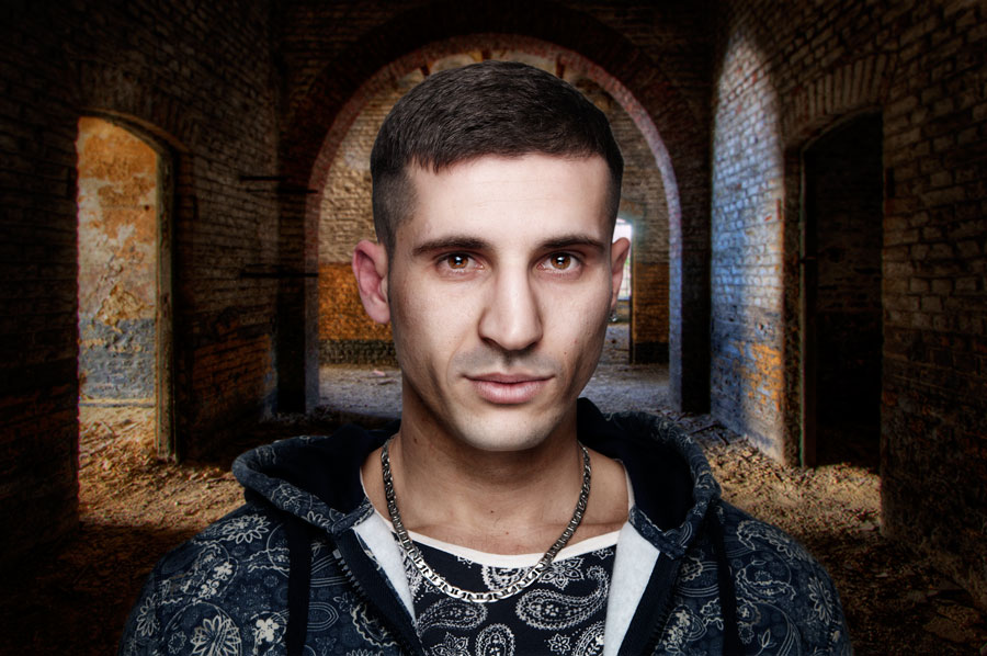 Scattata in studio con una luce flash diffusa dall'alto da un ombrello bianco, pannello riflettente sotto per riempire le ombre... poi in post produzione rimozione inserimento del nuovo sfondo.