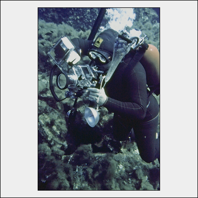 Utilizzava più o meno la stessa attrezzatura che usavo io ... la custodia era una Ikelite, credo in questo caso con l'oblo più lungo per alloggiare un Hexanon 50 mm f /3,5 macro su Konica T3, il lampeggiatore era un Braun scafandrato ma non mancava la possibilità di usare le lampadine.
