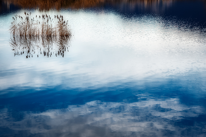 Purtroppo non sono riuscito a riprendere il cespuglio in maniera più centrale. Avrei corso il rischio di cadere in acqua. Ho voluto rendere protagoniste le nuvole riflessi in questo modo.