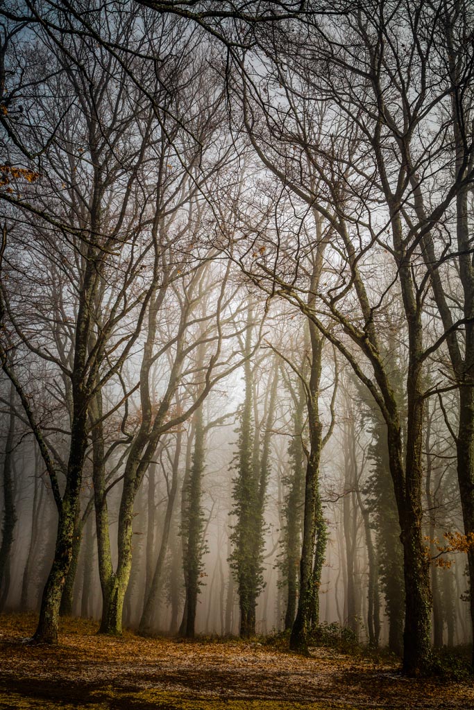 La nebbia, la altezza intuita dei fusti, e la luce azzeccata ed avvolgente entro il bosco, fanno di questo scatto un magico sortilegio. Un classico a cui la tortuosità dei profili regala personalità.