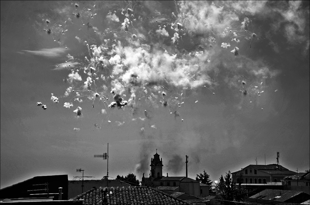 Originale questa ripresa diurna di fuochi artificiali,buono anche il bn,ma qualcosa non ha funzionato in post per quell'alone evidente intorno alle case.Uno scatto che ti consiglierei di rivedere partendo dall'originale perchè merita!