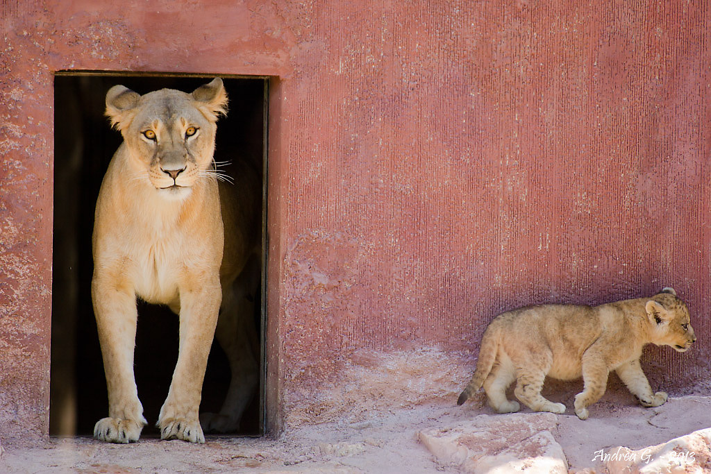 Lo so che i leoni in gabbia non sono certo liberi nel loro ambiente naturale.. ma questa foto ha una luminosa tenerezza, ed è molto piacevole nella resa brillante e nella tonalità complessiva. Apprezzabile il dettaglio a ben osservare, anche sul mantello di mamma e piccolo.