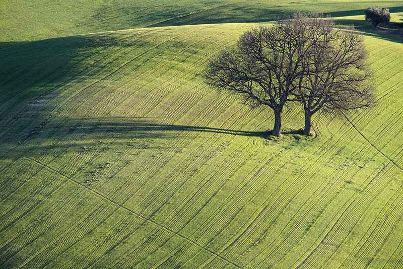 Una fotografia minimale, impeccabilmente composta e piacevolmente giocata sull'aspetto grafico che restituisce la pettinatura del terreno. Con un po' di pazienza si poteva clonare quel cavo che parte dall'albero di dx.