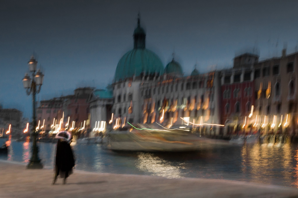 Non dico che la presenza fantasmatica della maschera non abbia una sua efficacia nella rappresentazione indistinta che ne fai, però la cornice nella quale è inserita con un tale grado di mosso generalizzato (soprattutto in virtù della presenza di tanti punti luminosi con le loro scie, comprese quelle del battello) non mi convince. Riuscita a metà.