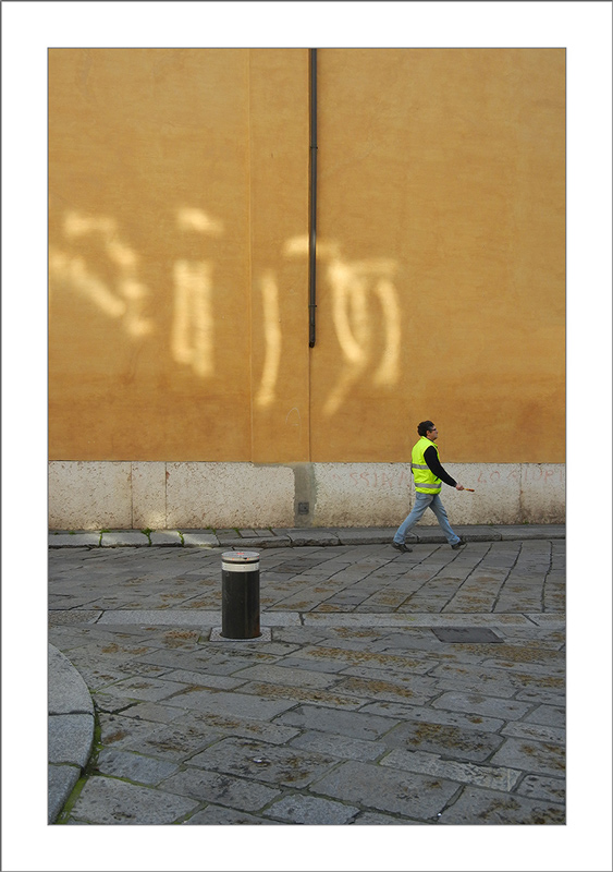 | essedi ha scritto: | Molto belli i cromatismi e fantastiche quelle strane luci sul muro,quasi un arcaico linguaggio.Interessante la composizione,avrei provato anche un taglio quadrato.Un grande saluto,Sergio.  | Concordo, sia sull'apprezzamento per quelle luci che scherzano alle spalle dell'uomo (lui che con quel giubottino giallo chissà che si crede), sia sulla possibilità di considerare un formato che facci ai conti con quanto ci si disperde soprattutto in basso.