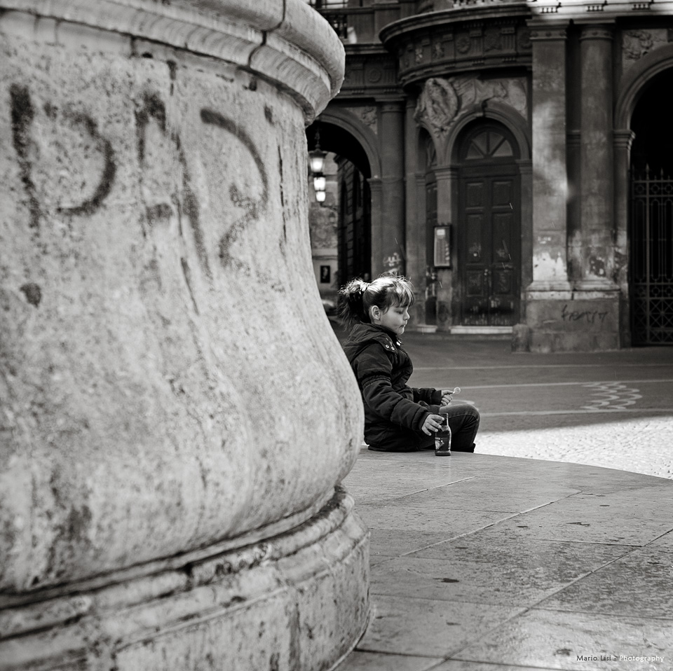 Ma se ci si sofferma un pò, a mio personale avviso, dovrebbe giungere quanto meno la sua natura insolita: una bimba, da sola ai bordi di una fontana. Il contesto della ripresa è quello di un alba di qualche giorno fa. Per lei, quella era la colazione, faticosamente immagino conquistata, al riparo dai tanti fratelli all'altro angolo della piazza. Se non è PAZZ... tutto ciò...