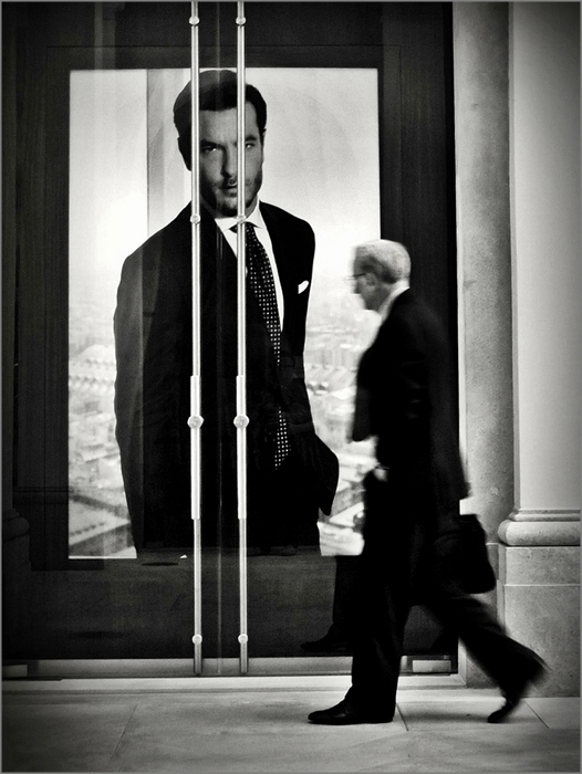 Bel dualismo tra staticità del manifesto e leggero movimento del passante che ha anche un ottima posizione nella camminata.