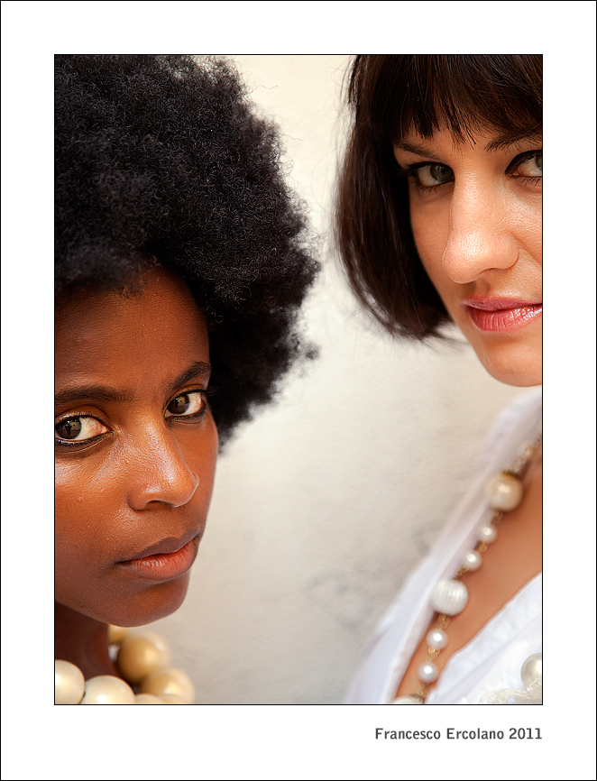 Grande resa di questo doppio ritratto. Non passa certo inosservato il candore quasi assoluto dello sfondo che fa risaltare ancor di più le due protagoniste, così diverse, in tutto, per primi nei due incarnati, che creano un contrasto visivo molto bello. Così diverse eppure sei stato abilissimo nel catturare il fascino di entrambi gli sguardi, il muto aggancio, nella stessa direzione visiva, dei dei loro punti di attenzione convergenti.