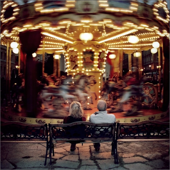 Che dire... se non che è bellissima... appena ho letto il titolo mi è venuto alla mente il film di Fellini, e pensando al regista mi trasmette indirettamente uan sensazione molto particolare come quella che i suoi film sanno trasmettere (anche se Amarcord alla fine è più "convenzionale" di molti altri suoi capolavori). Questa tua lettura di un ricordo mi fa pensare un po' alla metafora della vita, vista dai due personaggi seduti, nitidi, che rivedono tutta la loro vita scorrere davanti, dove l'idea di "ricordo" è trasmessa dalla giostra, che fa pensare ad un percorso mentale che inizia dall'adolescenza. Per farla breve la vedrei bene come un fotogramma di un film, dall'atmosfera molto felliniana, in perfetto stile "la città delle donne" per intendersi!