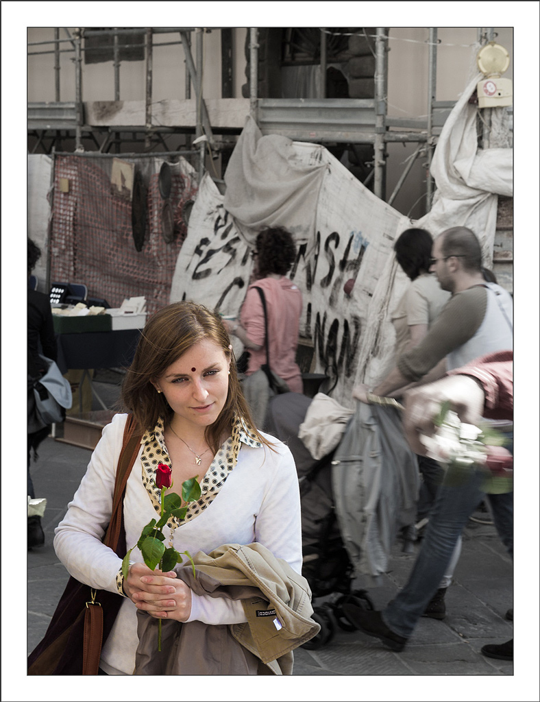 Sai che la ragazza ha un'espressione talmente particolare che trasformerei la foto in un ritratto classico verticale, lasciando fuori ogni elemento street che non aggiunge nulla.