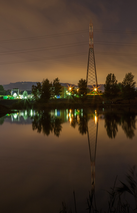 | Un paesaggio notturno cui i colori ed i riflessi dànno sapore. Direi che si potesse eliminare (o attendere a scattare) quella che presumo essere la traccia del passaggio di un aereo tra i cavi.