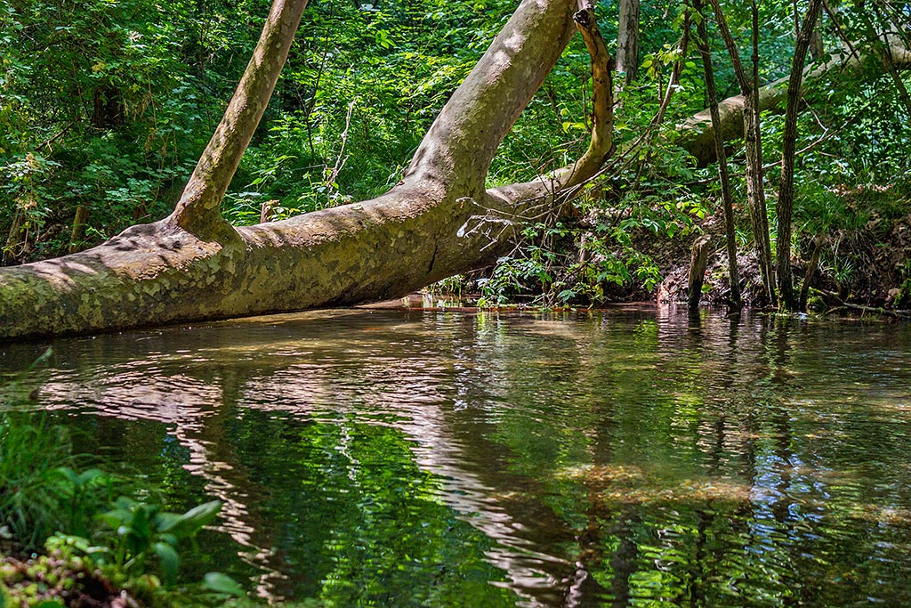 | Ciao c'è un forte contrasto,sembra che il sole sia ancora piuttosto alto,malgrado il bosco,il verde è molto intenso,l'albero caduto è imponente e con una forma interessante,comunque o mi sarei concentrato maggiormente sulla linea del tronco che sembra tagliare il fotogramma,riducento il primo piano oppure sul riflesso. |