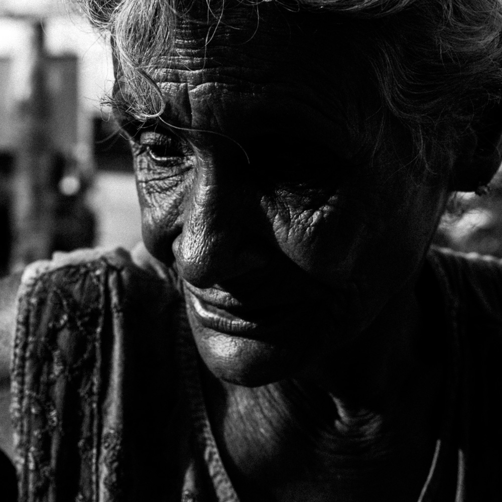 Un b-n duro come la pelle della signora è di grosso impatto emotivo perchè lo sguardo anche se coperto dalle ombre lascia trapelare una certa tristezza.