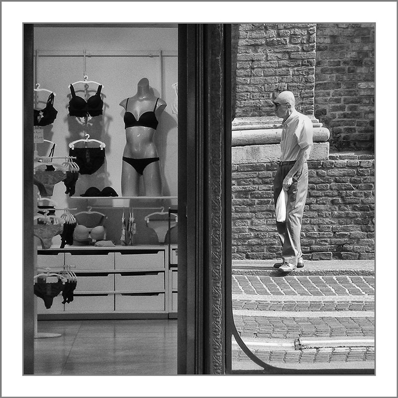 Per di più la foto soffre per l'accostamento assolutamente forzato , il signore che passa niente ci'azzecca con le mercanzie esposte in vetrina... |