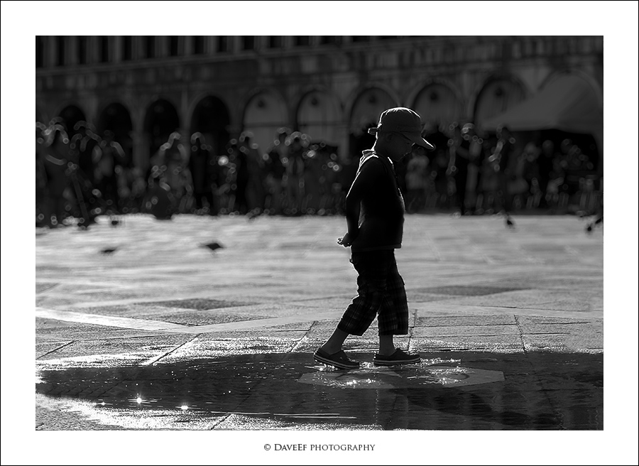 bellissima l'immagine di questo bimbo isolato dal resto della folla che gioca con una semplice pozzanghera