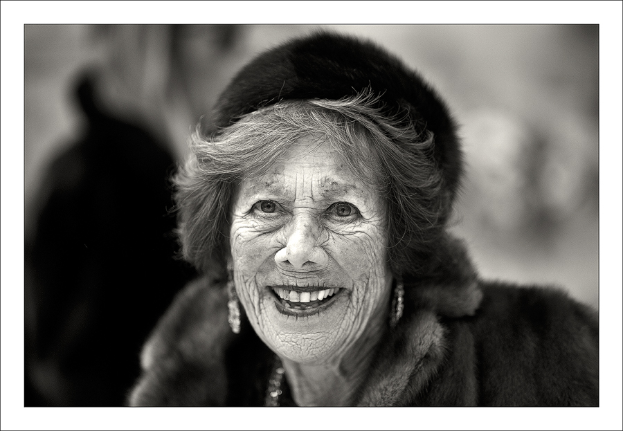 A me piace moltissimo. La pelliccia, il tipo di orecchini, il cappello. Sembra venire da un tempo già trascorso eppure presente. Una geografia di vita che si mostra in un sorriso che pare allargarsi sempre più ad illuminare il volto. Il tutto ha una sua grande eleganza .
