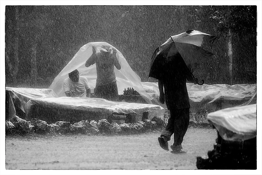 Questa pioggia torrenziale è la vera protagonista della scena,i due uomini sotto il telo sono più preoccupati dell'altro,con l'ombrello,che sembra passeggiare tranquillamente.Un ottimo scatto,eseguito in condizioni non facili e perfettamente composto.Bello anche il bn.Complimenti! Smile