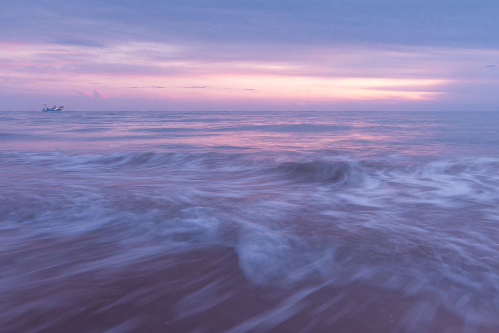 Un soggetto più volta visitato dai fotografi, eppure qui avverto come una marcia in più: la coerenza cromatica per tutto lo svolgimento del tema, con quel velo di violaazzurro che si macchia di rosa e tutto avvolge; e poi il piroscafo lontano, in posizione perfetta a bordo immagine, con tanto mare innanzi, come ad anticipare la maestosità di un viaggio infinito fra i flutti . E poi la morbidezza perfetta del mare, che qui interpreti come un fluire spumoso d'onde, di cui il tempo lungo addolcisce l'impeto. Ottima per me e fra le preferite.