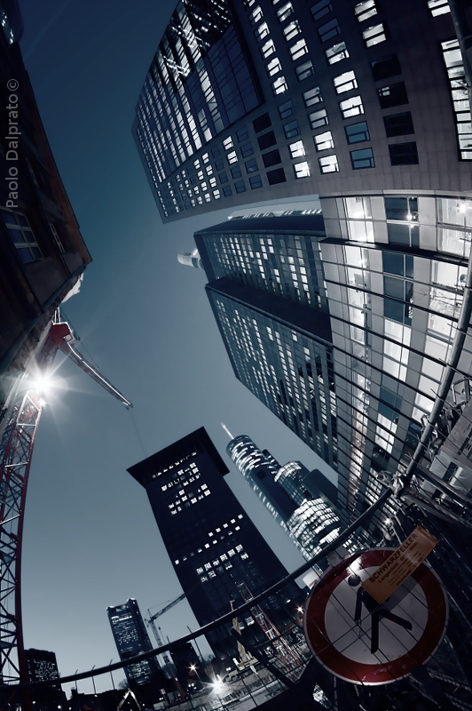 Nitidezza da invidiare.. angolo di ripresa fantastico enfatizzato dall'uso dell'ottica e dalla distorsione conseguente.. grandissima idea di avere in basso a destra quel cartello rosso che rimane quasi l'unico elemento di colore in tutta la scena.. architettura che non ne rimane affatto sacrificata o messa in secondo piano, ma nel suo complesso funziona in maniera impressionante.. palazzi, finestre, riflessi, luci.. davvero incredibile mix di elementi e di luci e ombre.. le due gru rimangono protagoniste insieme ai vetri e ai flares..