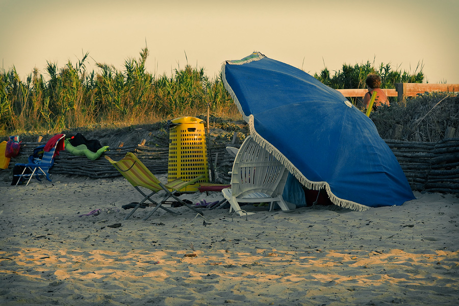 Dal punto di vista compositivo avrei spostato la mira appena a sinistra, avvicinando l'ombrellone al margine (dove adesso sembra esserci troppo vuoto) ed evitando di tagliare l'oggetto giallo a sinistra che fa anche da richiamo cromatico con altri elementi sulla scena.