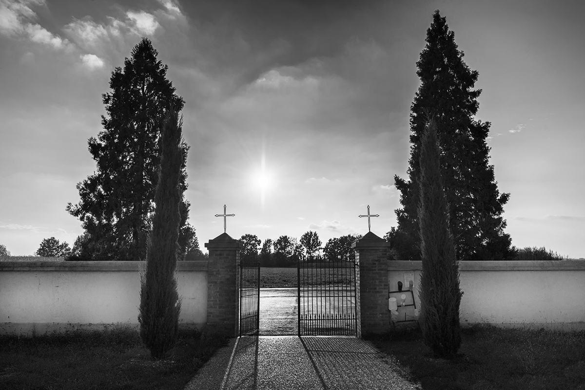 La mia impressione è che il titolo ne forzi un po' la lettura: la sensazione è quella di un varco d'uscita dal cimitero, verso spazi aperti e assolati, quindi contraria al titolo stesso.
