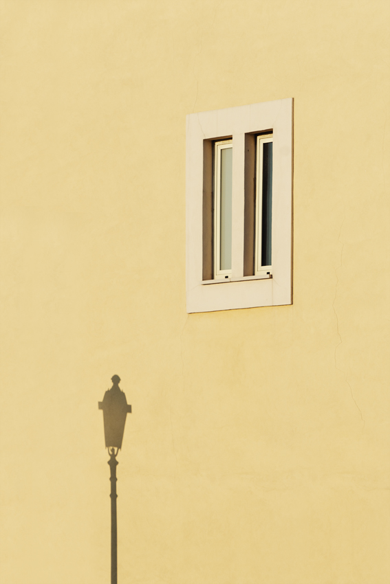 Delicatissima, quasi impalpabile, eppure che forza quell'ombra sottile e solo accennata sulla parere inondata di luce e abitata dal tridimensionalità netta della finestra. Il lampione, indirettamente descritto per ombra interposta, ha lo spessore misteriose di una presenza invisibile ma vibrante, come quel minuscolo particolare leggibile al confine fra palo stesso e lanterna, che pare una piccola ballerina a braccia alzate a sollevare il lume.