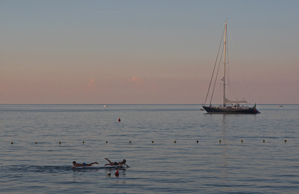 La fila di boe divide la quiete dal movimento dei ragazzini....complimenti per l'ottimo scatto.